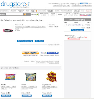 I was highly amused that adding diabetic testing supplies and a new meter (little! pink! easy!) would garner candy as a "great last minute idea." Usually the suggested impulse buys on Drugstore.com are geared toward your current or past purchases. This one says "Diabetics love to eat candy. Buy some candy!"